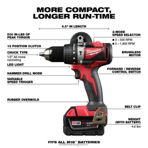 το m18 1/2 in. σφυροδράπανο/οδηγός χωρίς ψήκτρες παρέχει τη μεγαλύτερη ισχύ στην κατηγορία του, διατηρώντας παράλληλα συμπαγή Μέγεθος. αυτό το σφυροκοπτικό τρυπάνι 725 in-lbs ροπής και 0-550 / 0-1, 800 rpm, για ένα ευρύ φάσμα εφαρμογών διάτρησης και στερέωσης. Ο κινητήρας χωρίς ψήκτρες που έχει κατασκευαστεί από το Milwaukee, τα ηλεκτρονικά συστήματα redlink και οι μπαταρίες κόκκινου λιθίου παρέχουν πιο αποτελεσματική παροχή ισχύος, για λιγότερες διαδρομές στο φορτιστή. με μήκος μόνο 7,0 ίντσες και 4,6 λίβρες. (με μπαταρία), αυτό το σφυροδράπανο παρέχει εξαιρετικό έλεγχο και ισορροπία σε συμπαγές μέγεθος, ιδανικό για εργασία πάνω από το κεφάλι ή σε στενούς χώρους. ένα εξ ολοκλήρου μεταλλικό κιβώτιο ταχυτήτων και ένα μεταλλικό τσοκ 1/2 ιντσών παρέχει μέγιστη αντοχή.